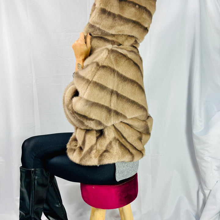 Dalla collezione Autunno/Inverno arriva lei, la nuova ecopelliccia con lavorazione diagonale effetto visone, disponibile in tre nuance sofisticate: beige, testa di moro e panna. La zip dorata, il collo morbido e la manica 3/4 la rendono un capospalla raffinato e versatile.