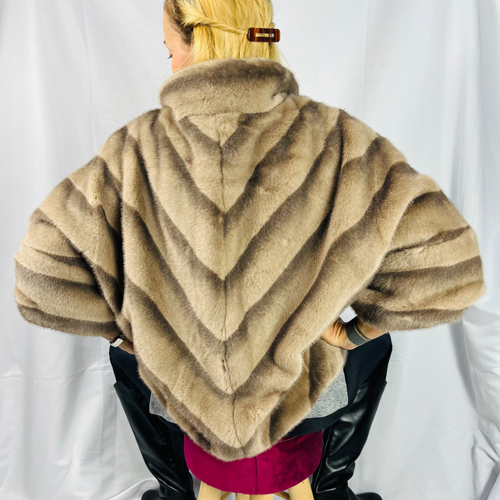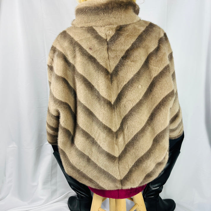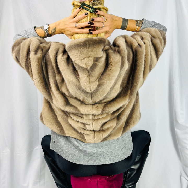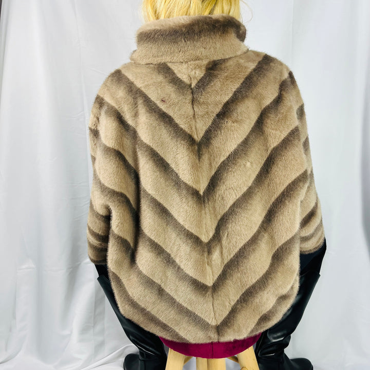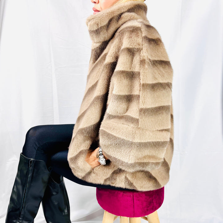 Dalla collezione Autunno/Inverno 2024-25 arriva Audrey, la nuova ecopelliccia con lavorazione diagonale effetto visone, disponibile in tre nuance sofisticate: beige, testa di moro e panna. La zip dorata, il collo morbido e la manica 3/4 la rendono un capospalla raffinato e versatile.
