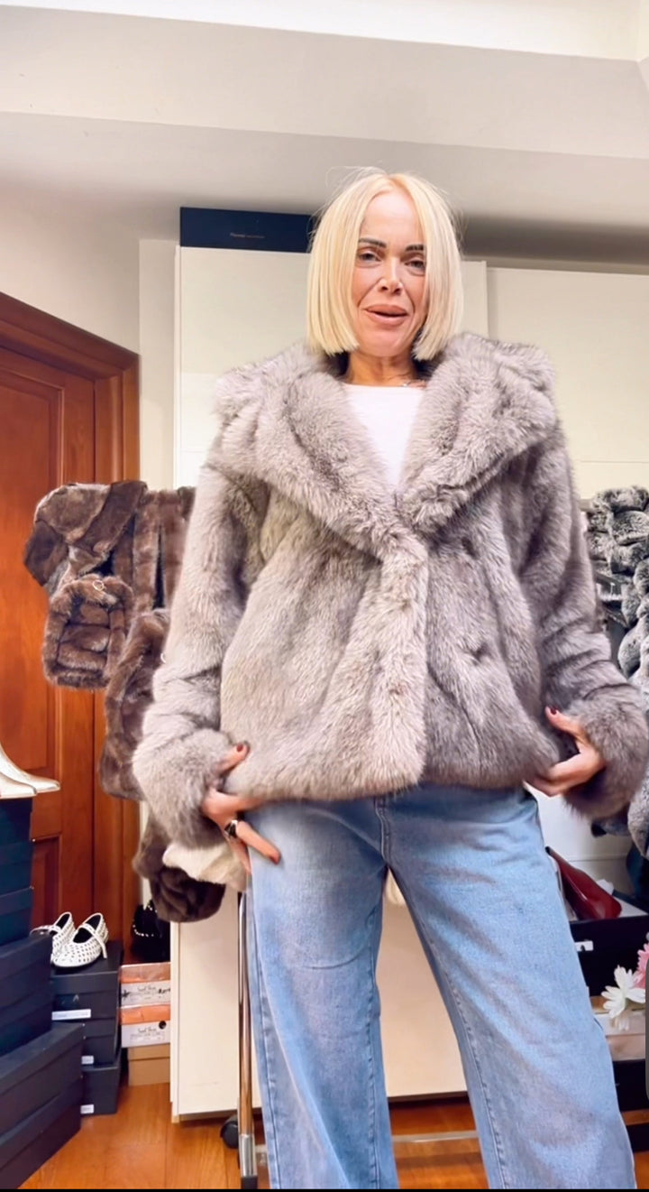 Dalla collezione Autunno/Inverno arriva lei, la nuova ecopelliccia color fumo, scollatura a V, taglio ampio, vestibilità perfetta.