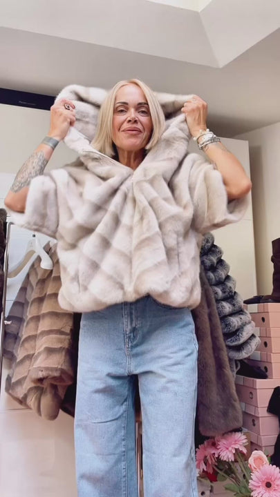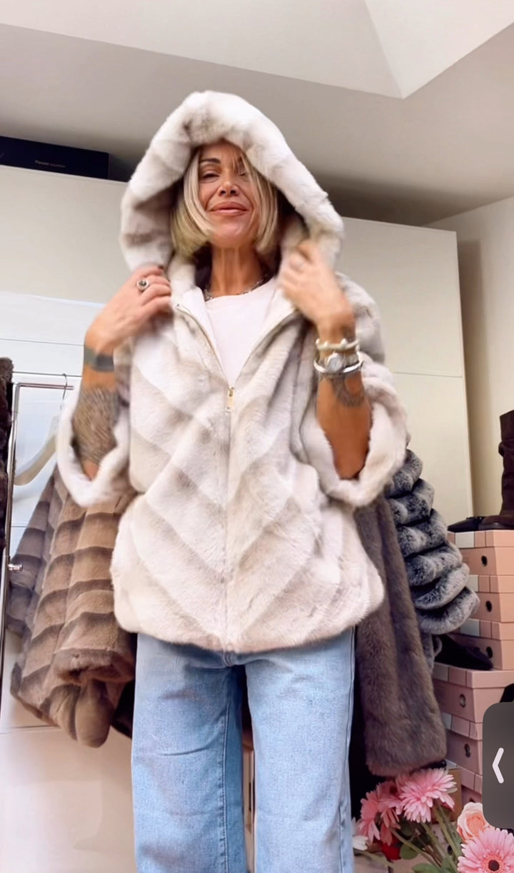 Dalla collezione Autunno/Inverno arriva lei, la nuova ecopelliccia con lavorazione diagonale effetto visone, disponibile in tre nuance sofisticate: beige, testa di moro e panna. La zip dorata, il collo morbido e la manica 3/4 la rendono un capospalla raffinato e versatile.