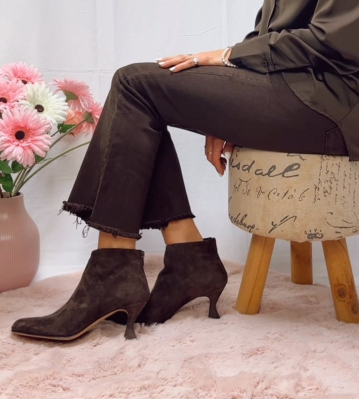 Tronchetti in camoscio italiano, tacco 5cm, calzata regolare.