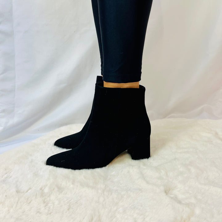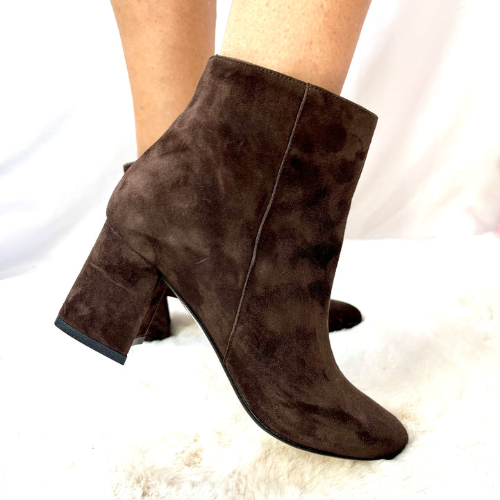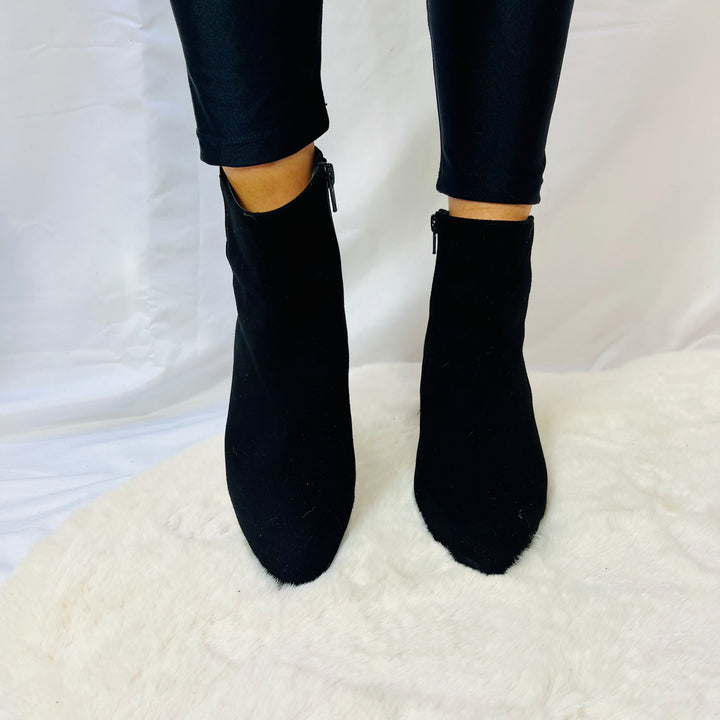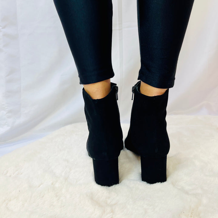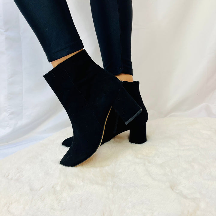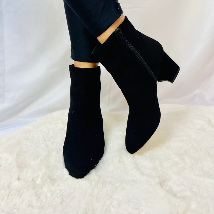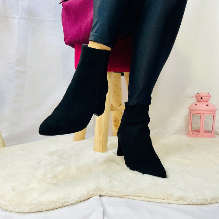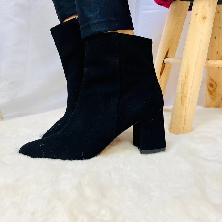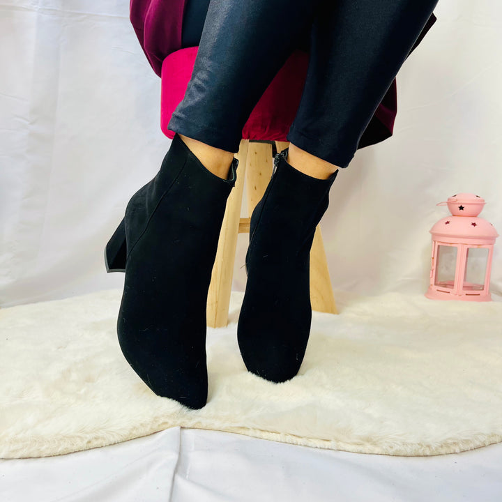 Tronchetti in camoscio e pelle naplak italiana, tacco 5cm, calzata regolare.