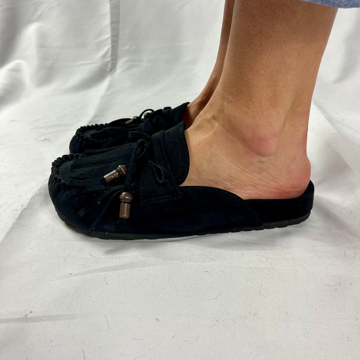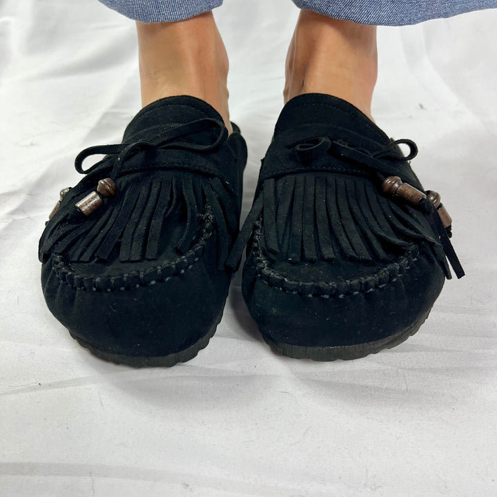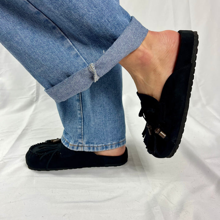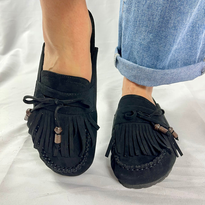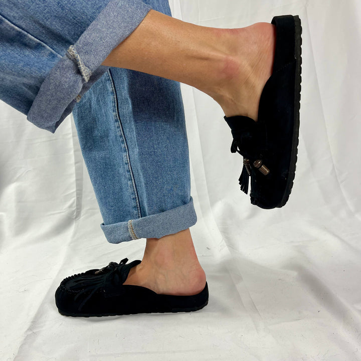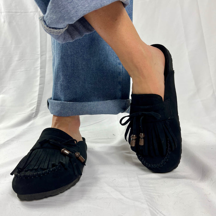 Scegli il comfort e lo stile dei Sabot Clogs Bilbao In Ecocamoscio Con Frange, perfetti per ogni occasione. Realizzati in morbido ecocamoscio nero con deliziose frange, donano un tocco moderno e versatile al tuo look.