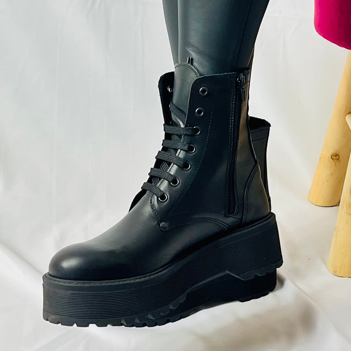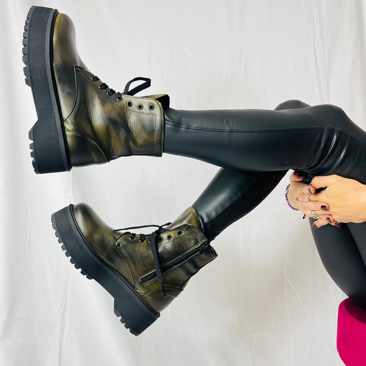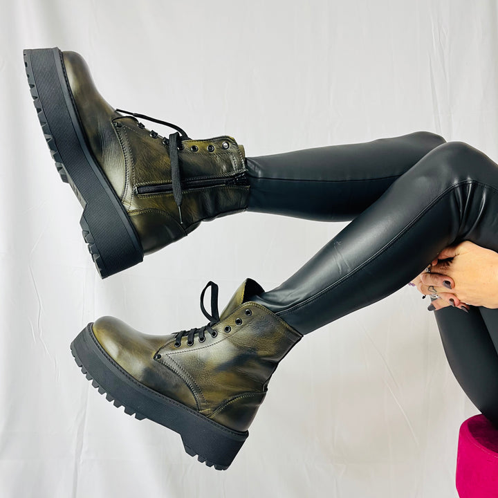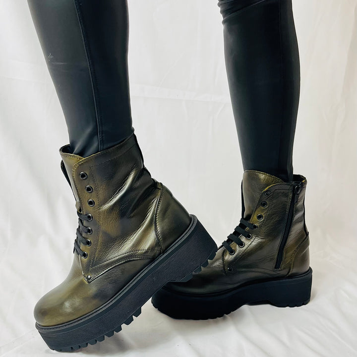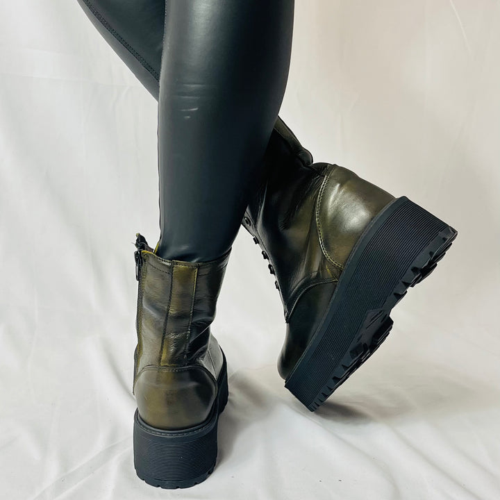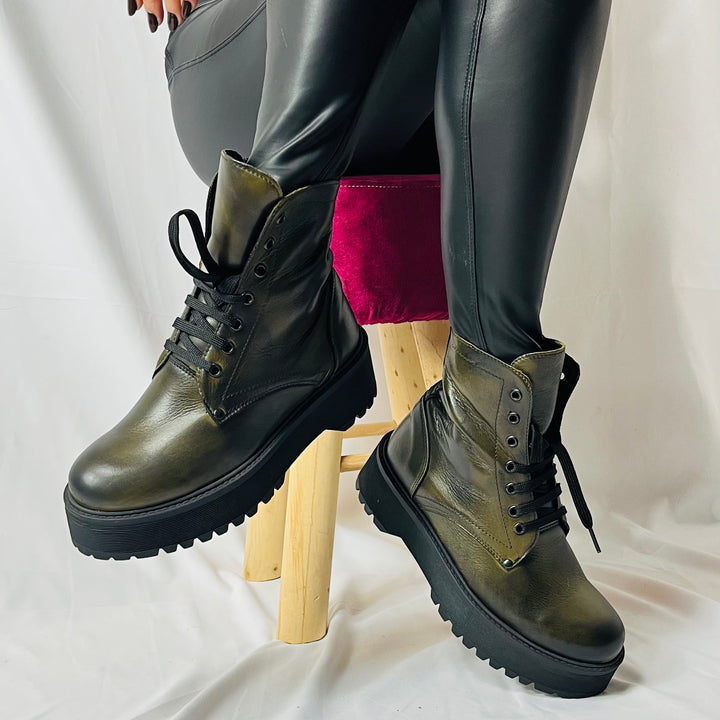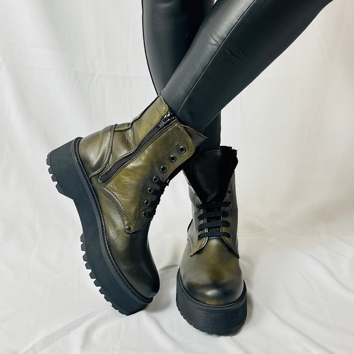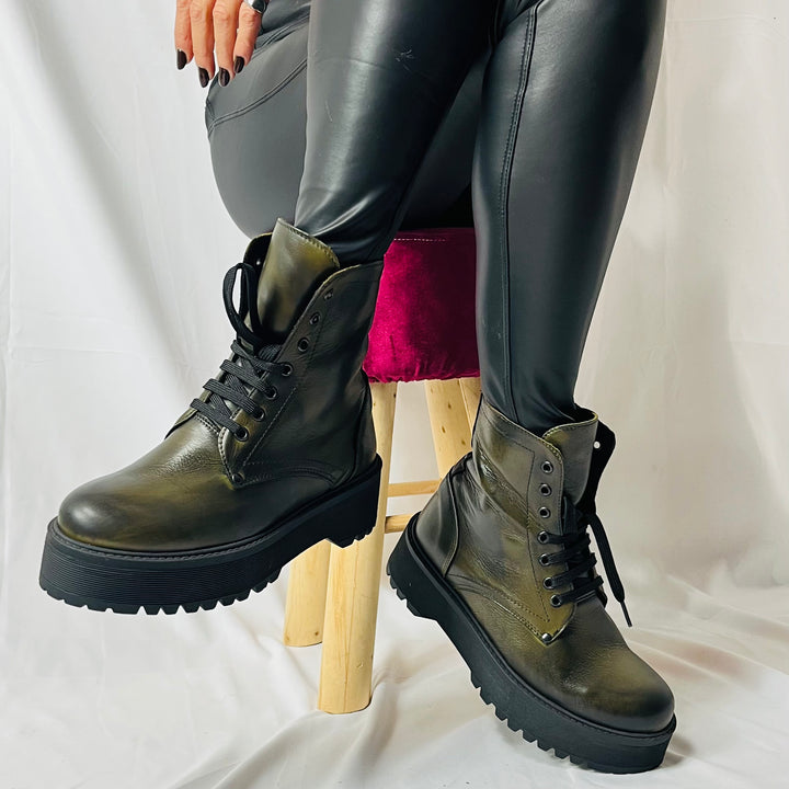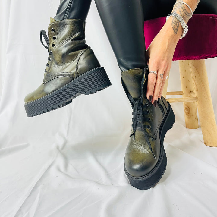 Stivaletti platform Agnese, disponibili in due colori nero e verde mililtare. Allacciatura: lacci e cerniera interna. Calzata regolare.