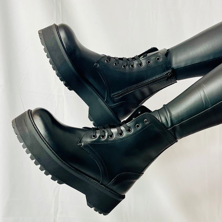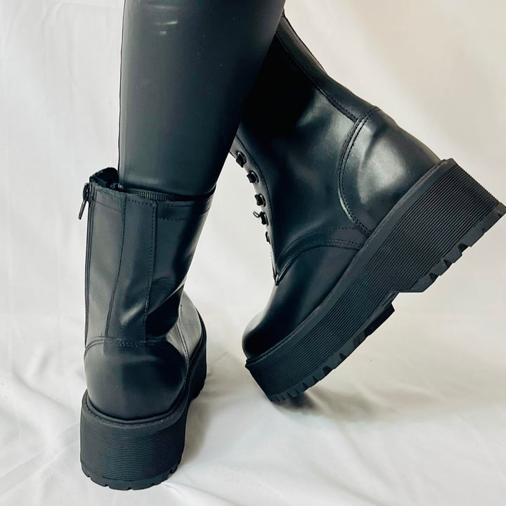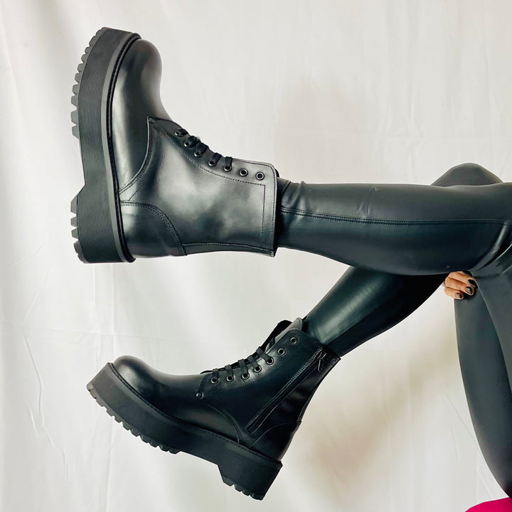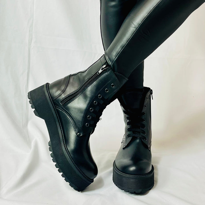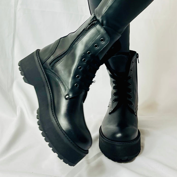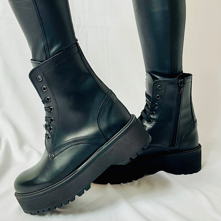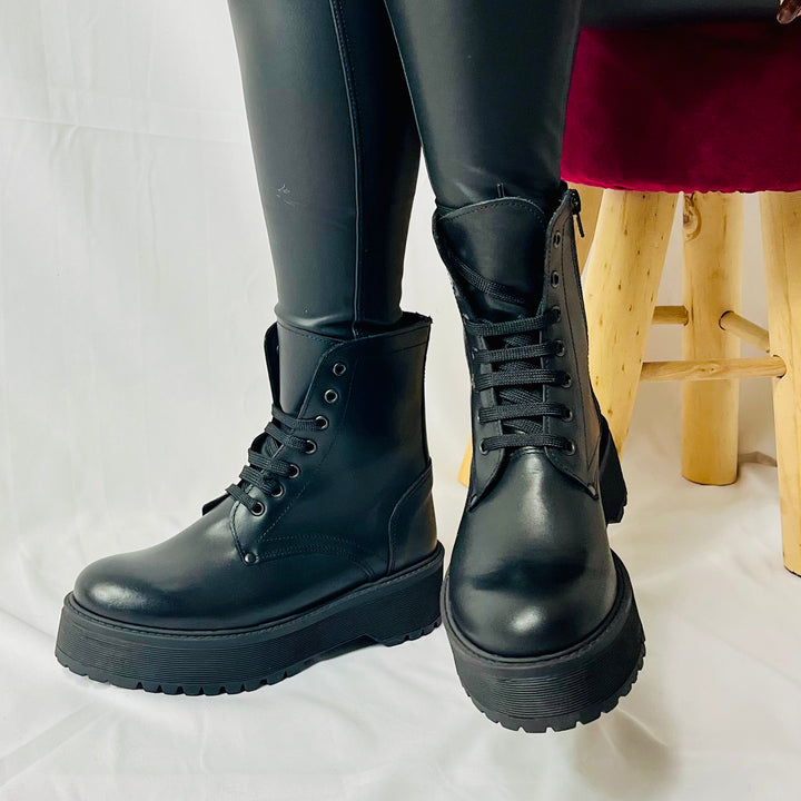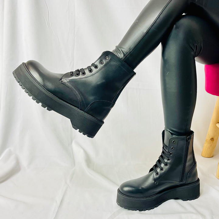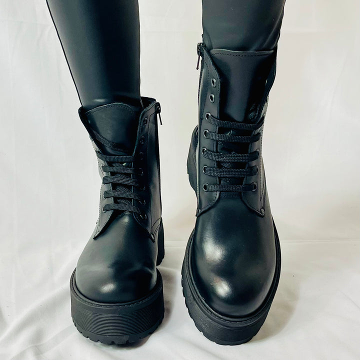 Stivaletti platform Agnese, disponibili in due colori nero e verde mililtare. Allacciatura: lacci e cerniera interna. Calzata regolare.